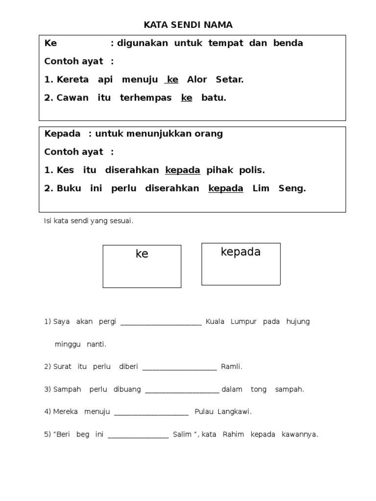 Ke-menunjukkan tempat atau arah. Contoh Kata Sendi Nama Tahun 6 Doc Assgment Bm Qistina Nabila Academia Edu. Frasa sendi nama sebagai keterangan Dia berbicara tentang perkara itu.